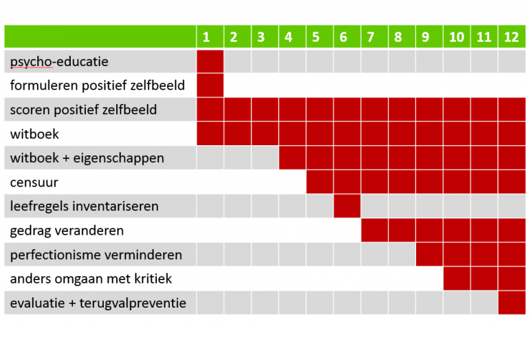 De training bestaat uit 9 wekelijkse sessie van anderhalf uur. Het draaiboek volgt de stappen die in de interventie in mijn boek Negatief zelfbeeld worden beschreven.